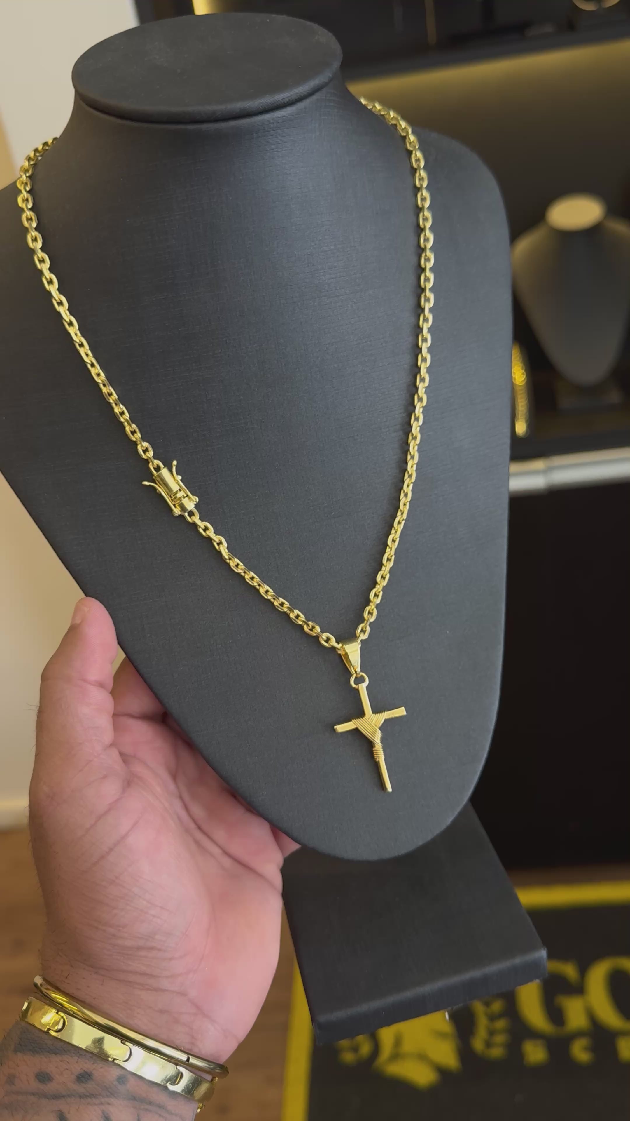 Kit Corrente e Pulseira Cadeado 4mm + Pingente Cruz Amarrada Banhado | Fecho Canhão